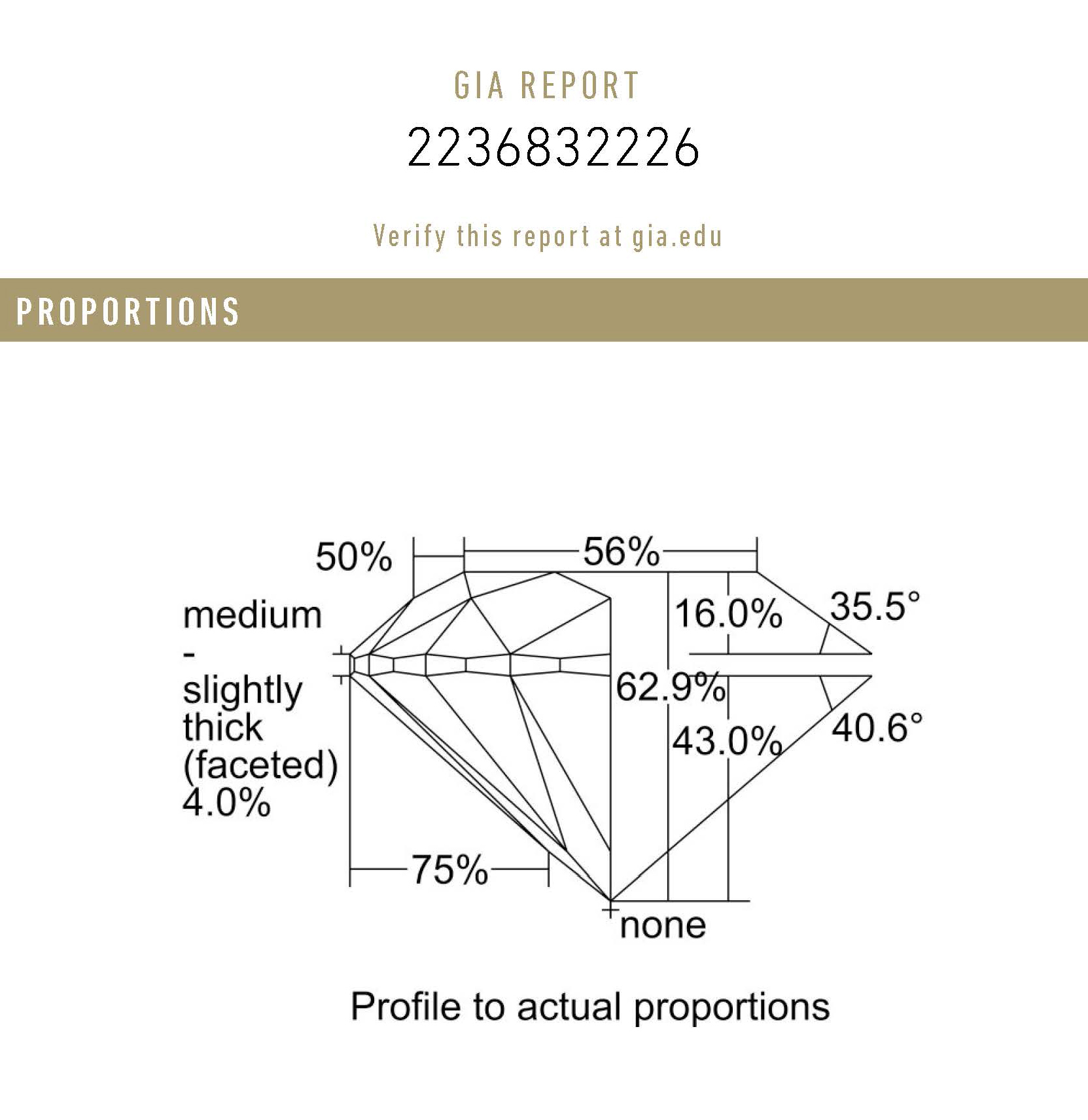 Measurements 指出鑽石長闊高, 圓鑽會顯示最闊及最窄圓周直徑數值, 最後數字為高度 (由枱面至尖底)