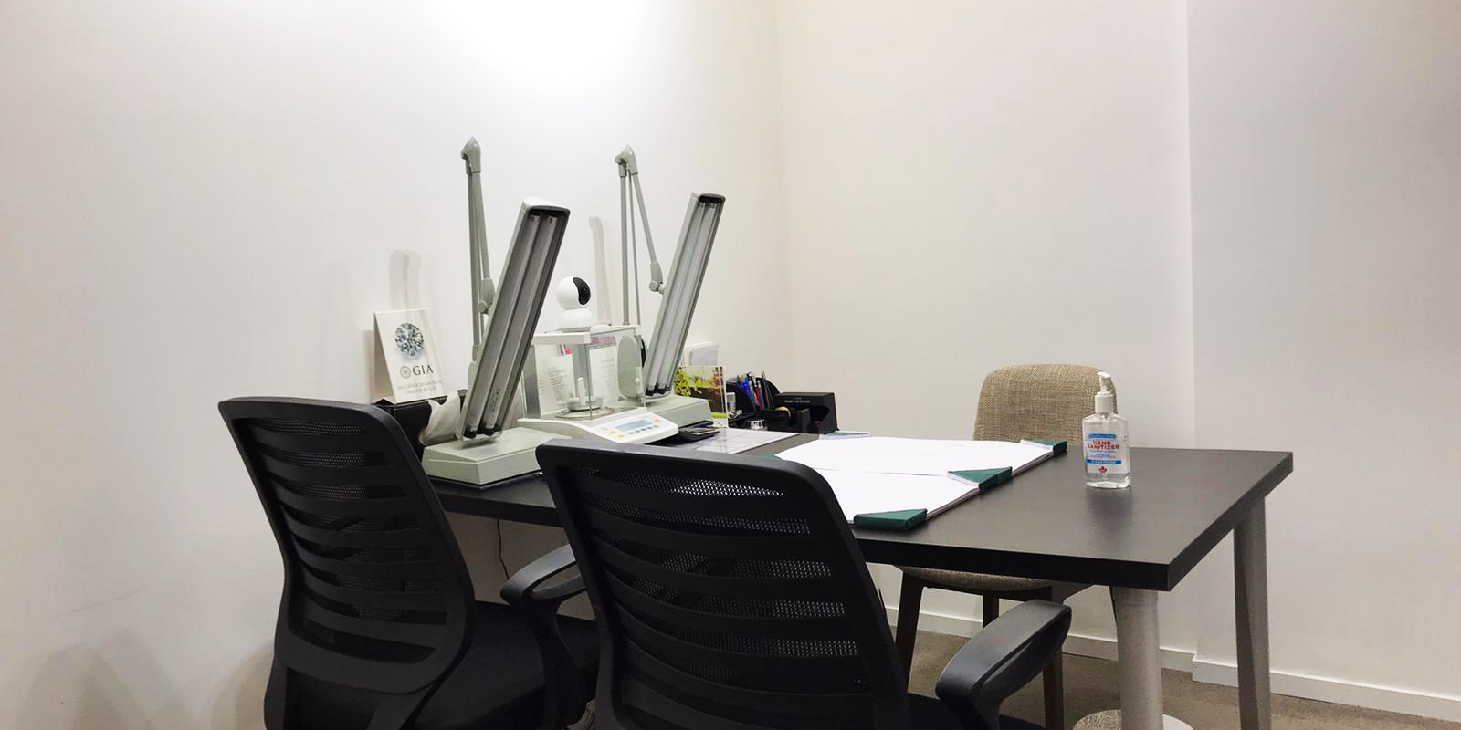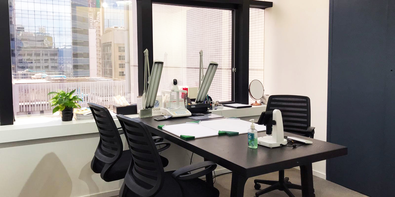 同時, 我們為你提供寧靜舒適, 獨立及專業配備的房間揀選鑽石, 所有房間都以白色為背景, 有檢查鑽石專用的鑽石燈, 專業放大鏡及其他所需工具。